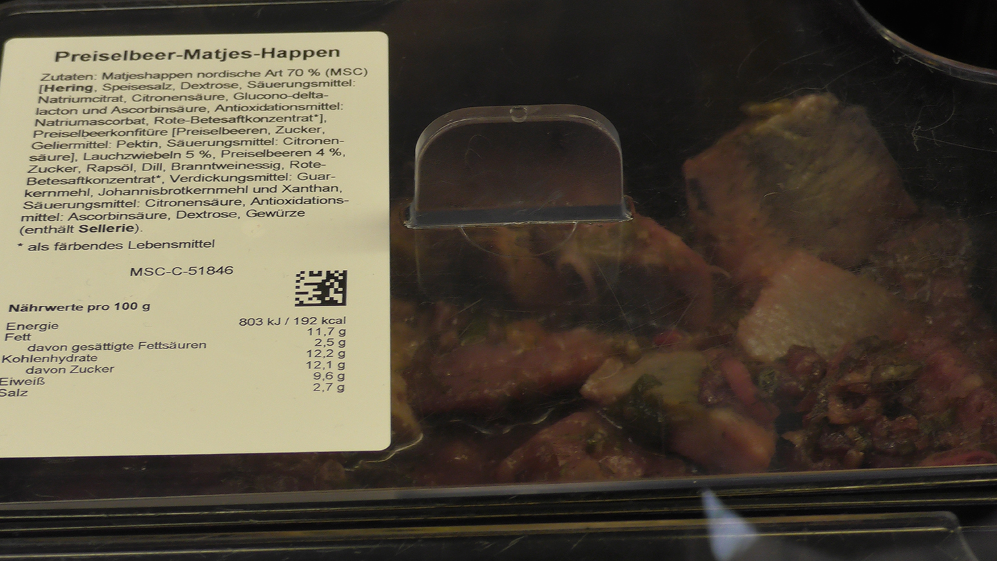 Matjes Happen nordische Art 70%, Preiselbeerkonfitüre, Lauchzwiebeln, Preiselbeeren, Zucker, Raspöl, Dill, Branntweinessig, Rote-Beete Konzentrat, Sellerie