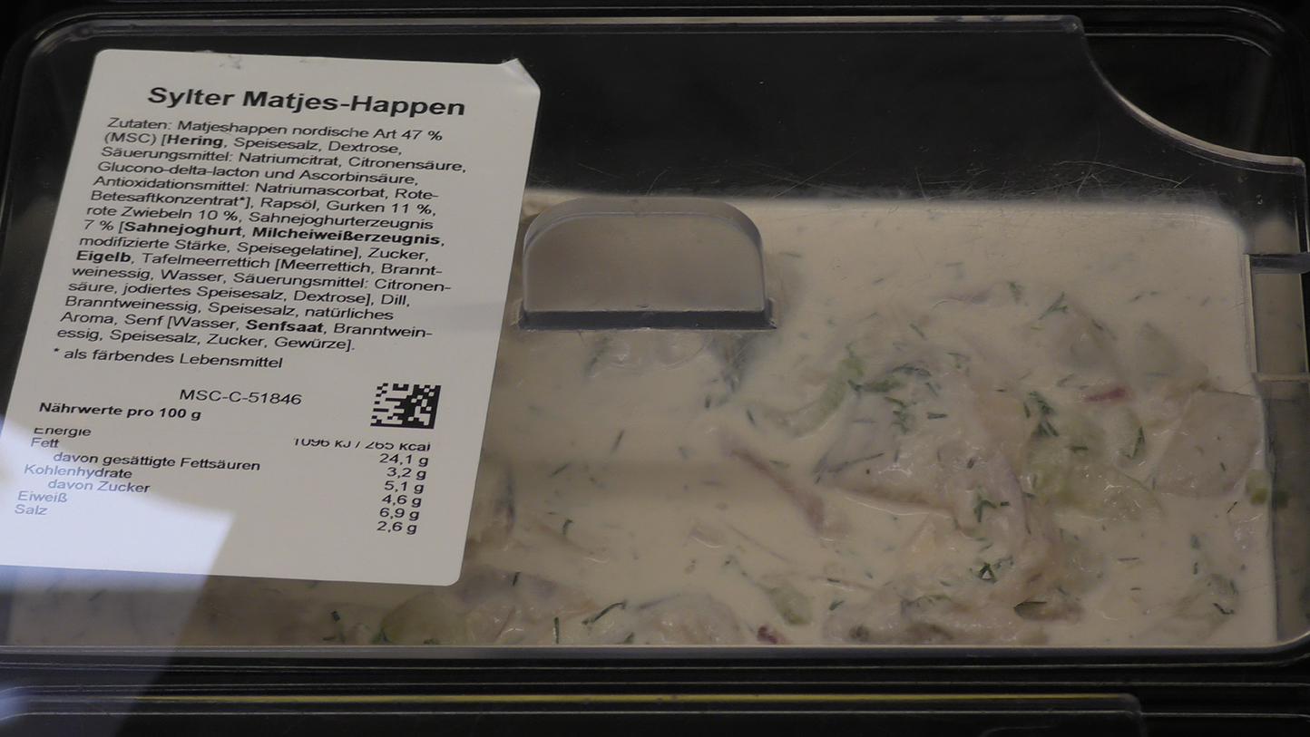 Hering, Speisesalz, Rapsöl, Gurken, rote Zwiebeln, Sahnejoghurterzeugnis, Zucker, Eigelb, Tafelmeerretich, Dill, Branntweinessig